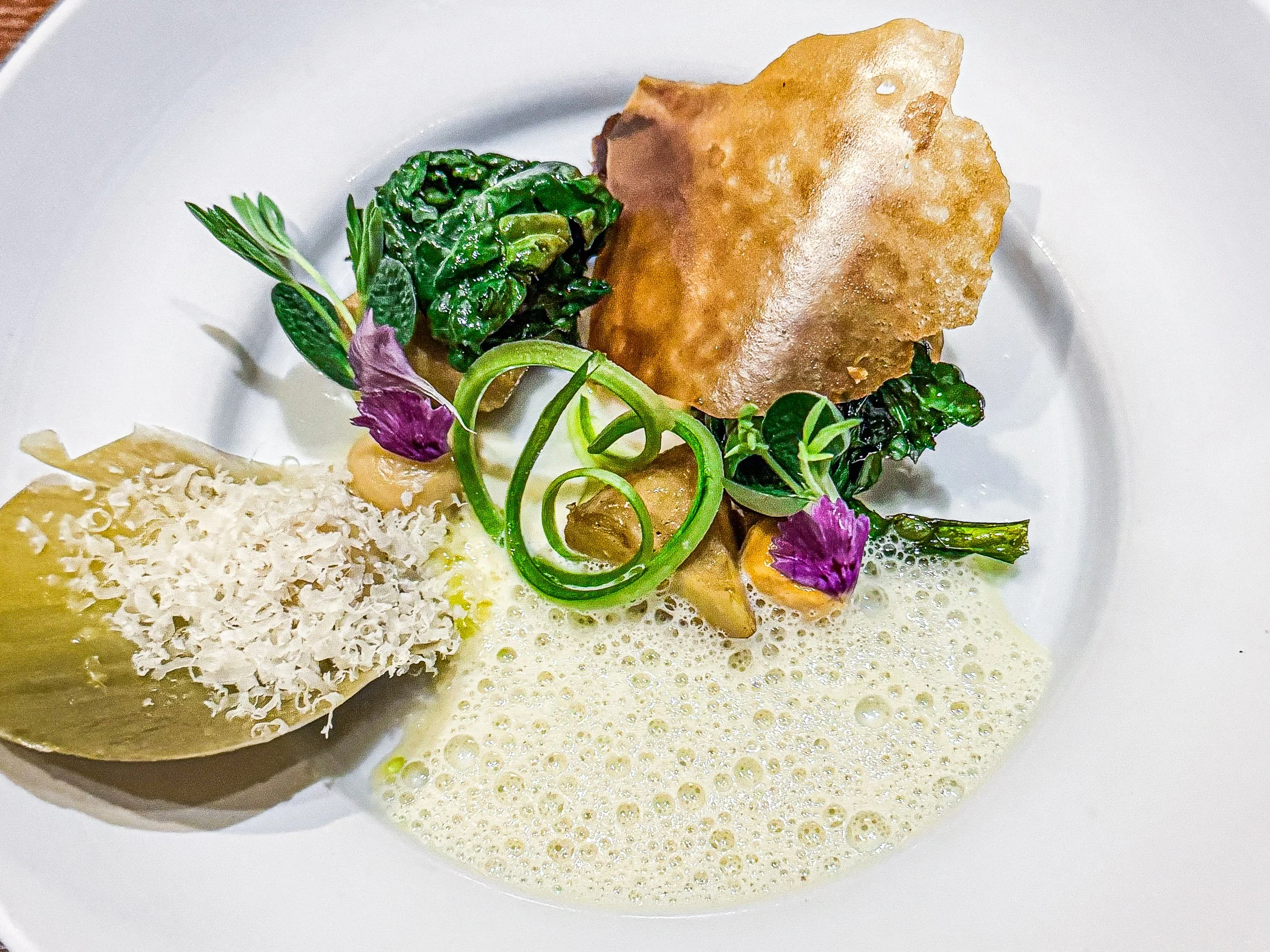 Das Menü hat mich überzeugt. Fünf von sechs Gängen haben für mich den Nagel auf den Kopf getroffen. Mein Favorit war ganz klar der Auftakt: „Kokosnuss“. Ein Sud aus grünem Curry mit Ingwer-Kombucha, dazu ein Schaum-Mousse, geeiste Kokosperlen, Baiser aus Kokosnusspulver, geröstetes Eis, roter Chili, Kürbis, ein intensives Zwiebelpüree, Apfel – und dazu eine gehörige Note von Kaffirlimette und Koriander. Right down my alley. Dann der Zander, begleitet von Sauerkraut mit Ananas und peruanischer Minze in einer Beurre Blanc, die naturgemäß so köstlich war, dass ich mich fragte, ob ich den Teller ablecken kann, ohne aufzufallen. Auch der Garnelen-Cocktail und das Hühnerfrikassee waren perfekt balanciert. Nur der Sichuan-Hase war nicht so meins.