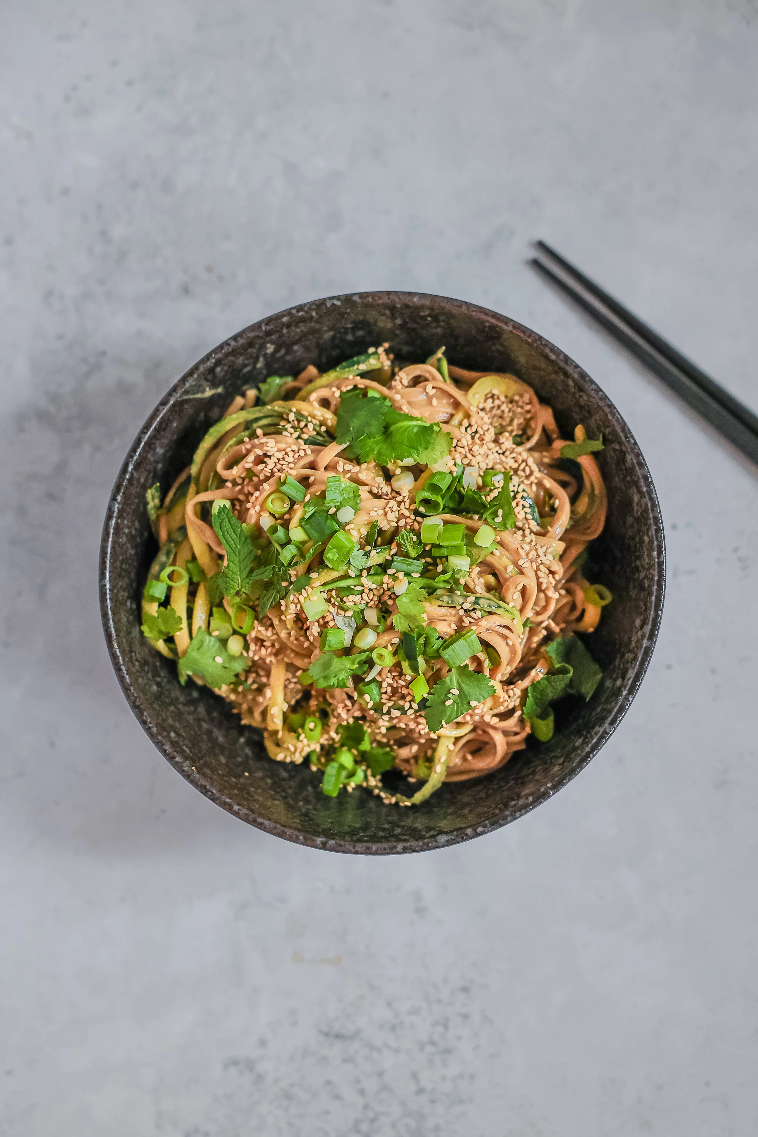 Für das Dressing alle Zutaten gut verrühren. Am Serviertag Gurke schälen, entkernen und in feine Streifen schneiden oder wie ich waschen, ganz lassen und Zoodles daraus machen. Frühlingszwiebeln in feine Ringe, Kräuter grob hacken. Nudeln mit dem Dressing mischen, Gurke, Zwiebeln und Kräuter unterheben. Mit geröstetem Sesam bestreuen und servieren.