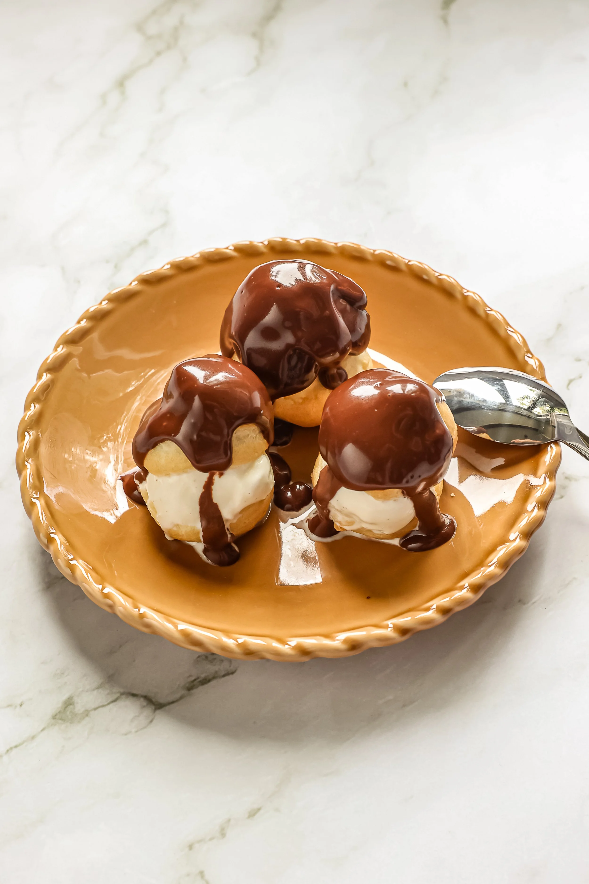 Die Profiteroles aufschneiden, mit etwas Vanilleeis füllen, mit der Schokoladensauce übergießen und sofort servieren.