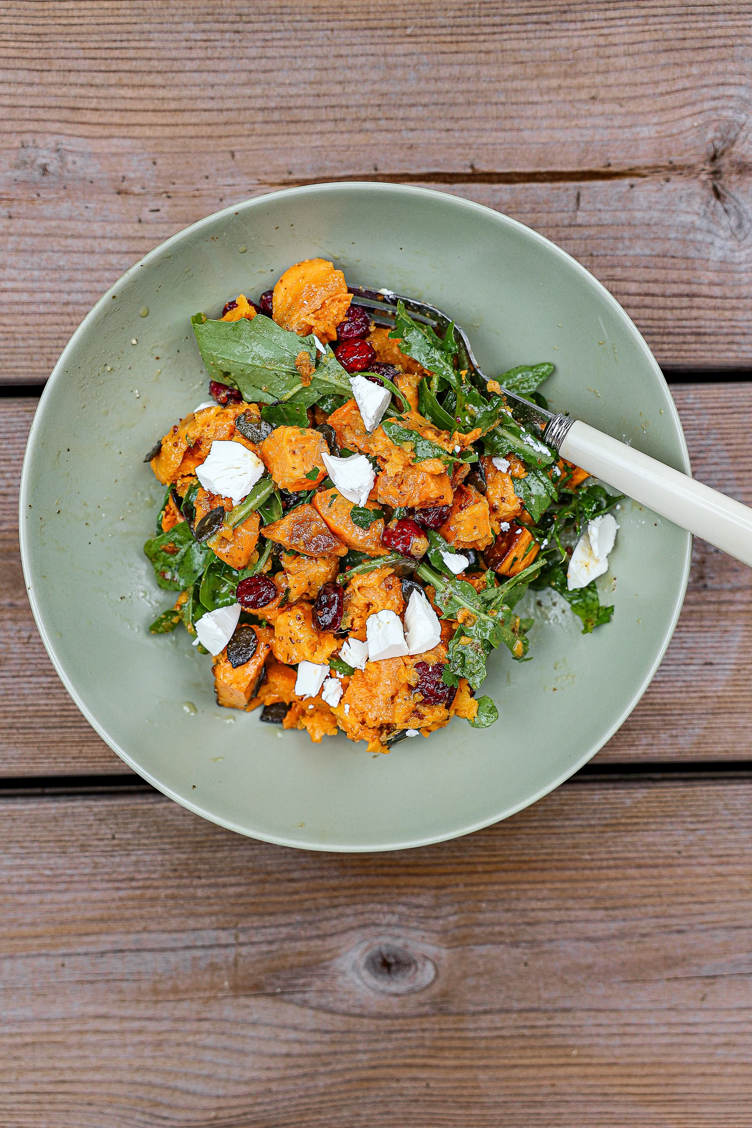 Süßkartoffeln schälen und in ca. 3 cm große Würfel schneiden. Mit Olivenöl, Knoblauchpulver, Salz und Pfeffer vermengen und flach auf einem Backblech verteilen. Bei 230 °C Umluft ca. 25 Minuten rösten, ohne Wenden. Danach vollständig abkühlen lassen und abgedeckt kühl stellen. Am Serviertag Süßkartoffeln mit dem Dressing vermengen. Rucola waschen, grob hacken. Schalotte schälen, fein hacken. Rucola, Schalottenwürfel, Radieschenscheiben, Cranberries, Kürbiskerne und zerbröselten Feta locker unter die Kartoffeln heben. Abschmecken und servieren.